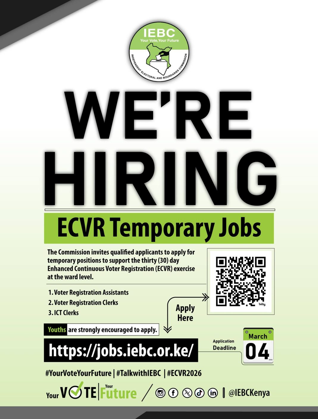 The Independent Electoral and Boundaries Commission (IEBC) has opened applications for 12,520 temporary positions to support a 30-day Enhanced Continuous Voter Registration (ECVR) exercise at the ward level across the country.
